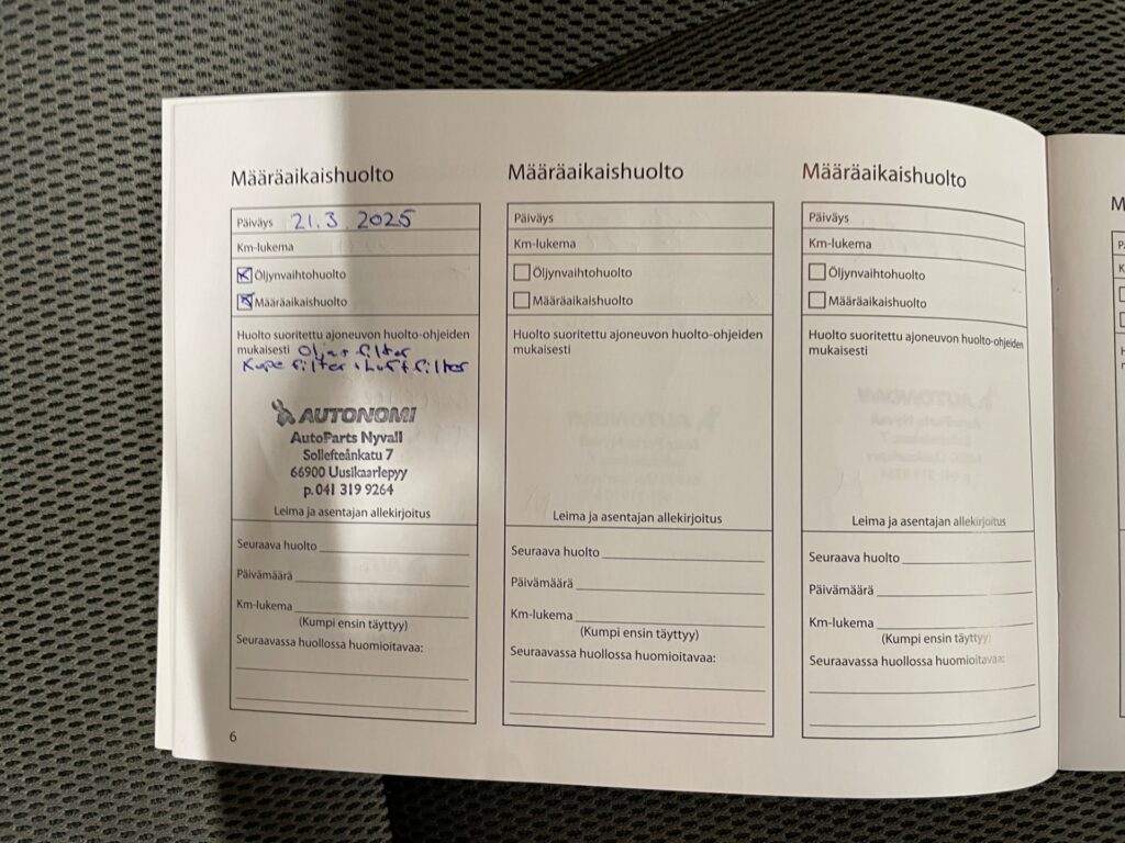 - Viimeisin huolto tehty 3/2025